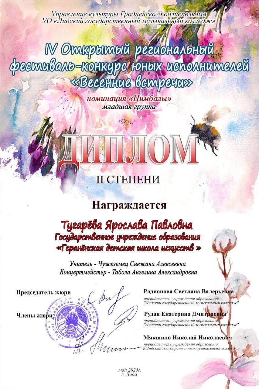 🎶 Тугарёва Ярослава - Дипломант II степени (учитель Чужеземец С.А., концертмейстер Табола А.А.)