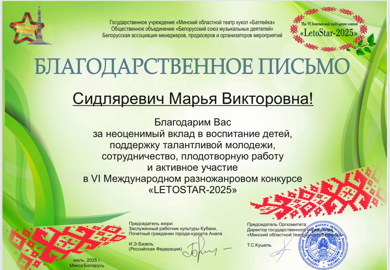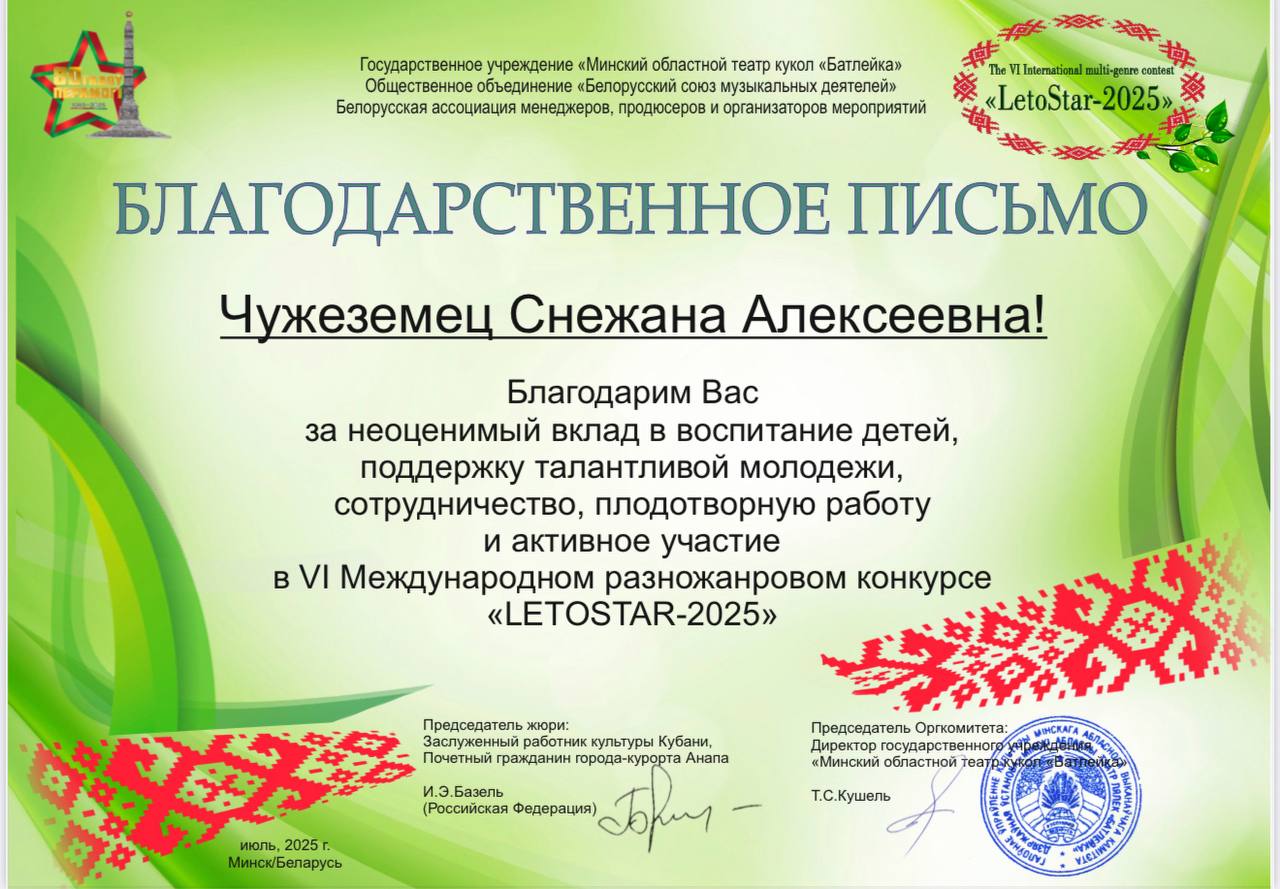 💐 Благодарность оргкомитета конкурса за неоценимый вклад в воспитание детей, поддержку талантливой молодежи, сотрудничество, плодотворную работу и активное участие в VI Международном разножанровом конкурсе «LETOSTAR-2025» объявлена: